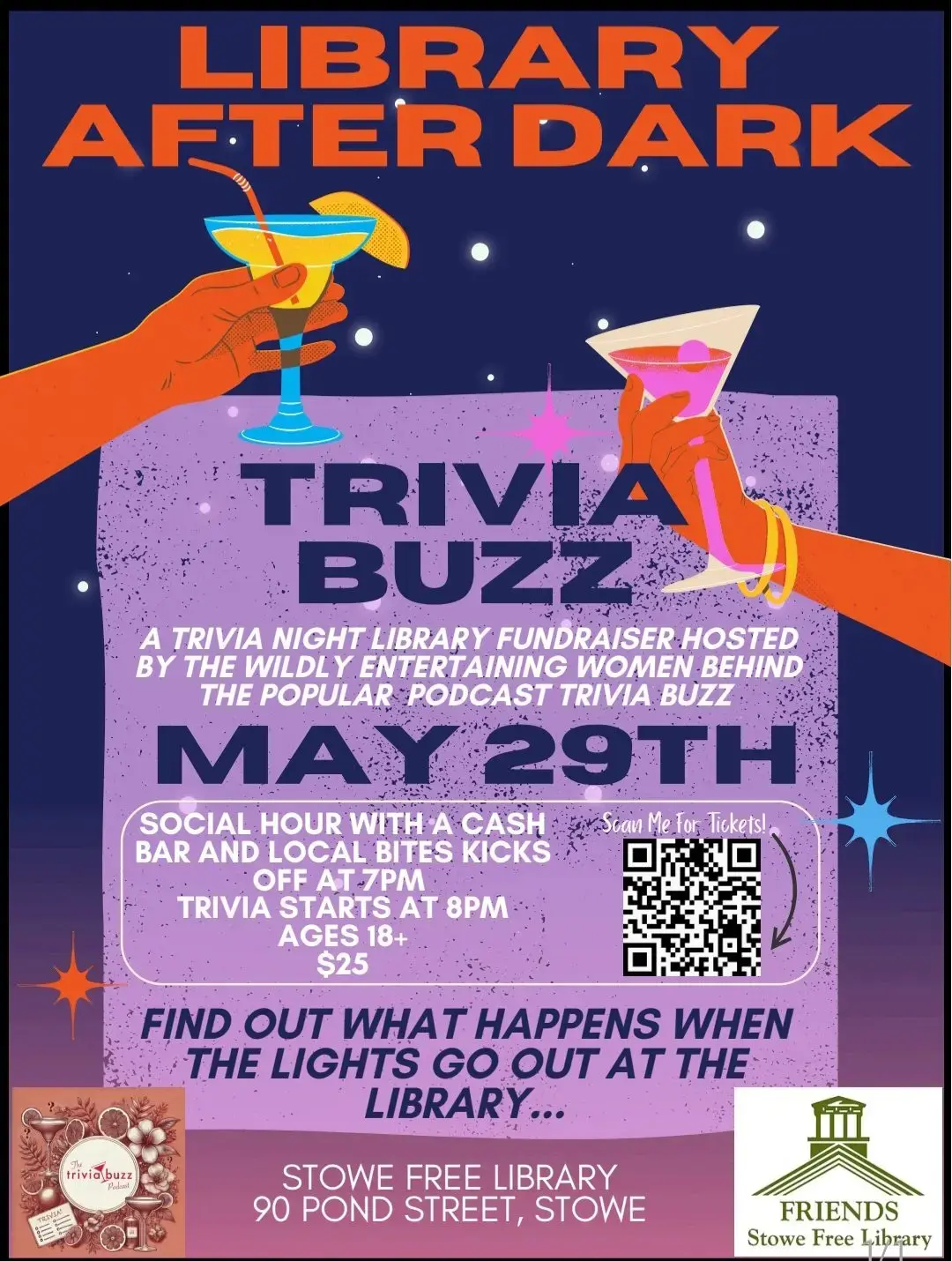 The Friends of the Stowe Free Library is holding a fundraiser featuring Stowe’s own Trivia Buzz pod. The evening will be a casual evening for those 18 and older. Doors, front and back, open at 7pm for